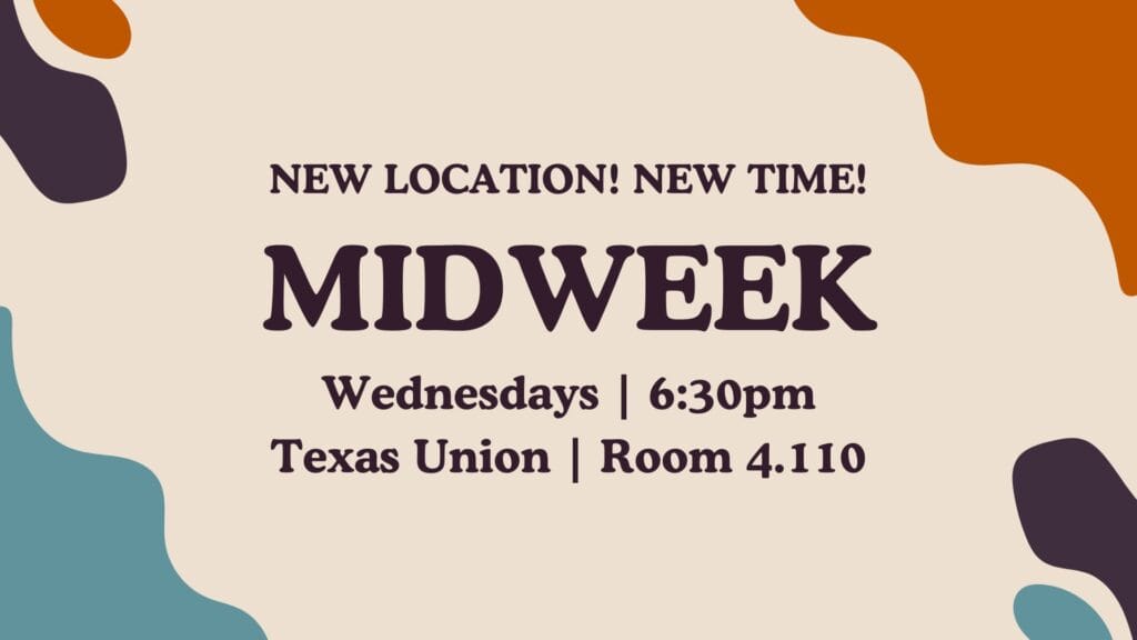 Midweek kicks off on January 21st for the semester—we meet Wednesday night at 6:30pm at the Texas Union. Email Ben for more details.